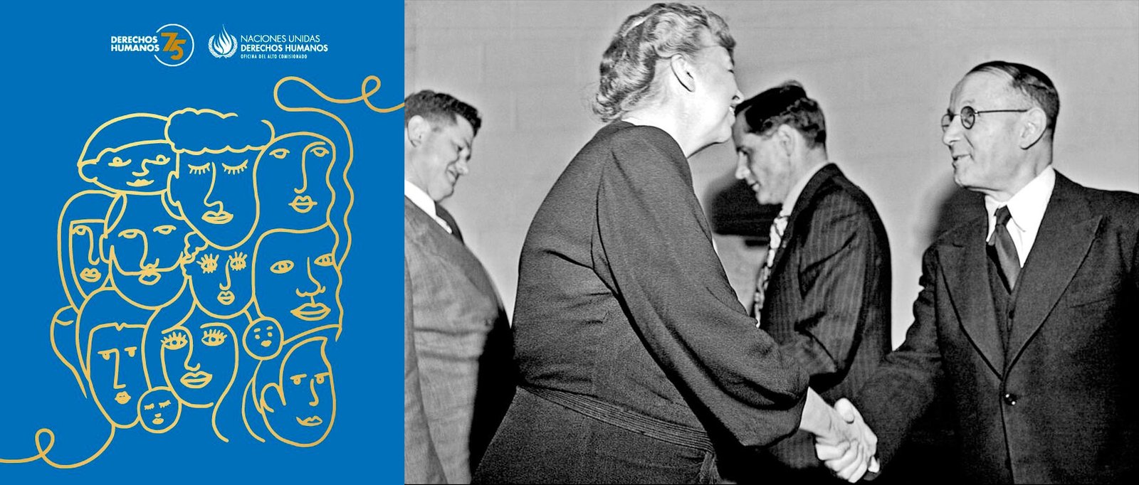 (A la izquierda cartel conmemorativo del 75º aniversario; a la derecha imagen de Eleanor Roosevelt, representante de Estados Unidos y Presidenta de la Comisión de Derechos Humanos da la bienvenida al profesor Vladimir M. Koretsky, representante de la URSS, a la tercera sesión de la Comisión el 9 de junio de 1947)