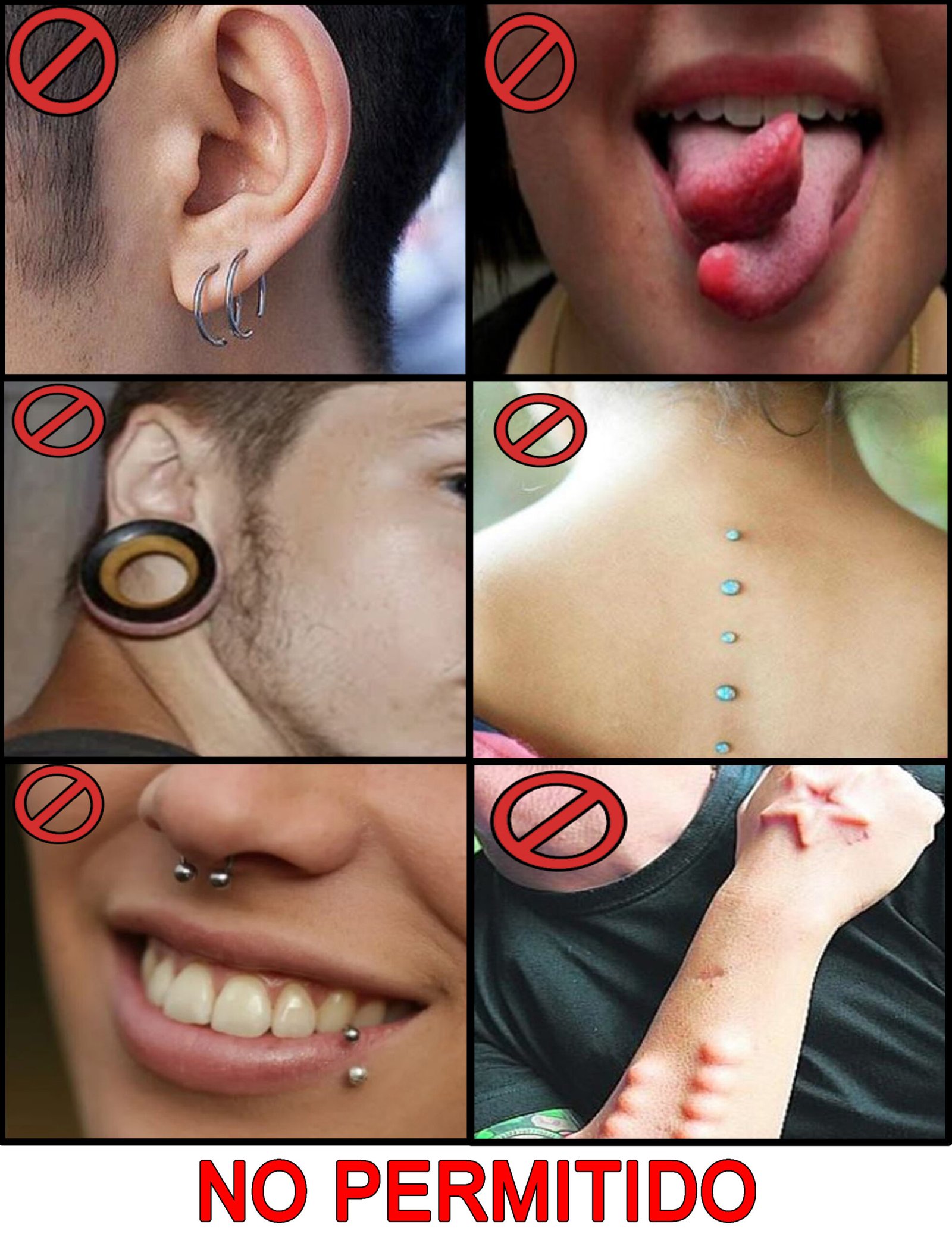 Del mismo modo y será excluido del proceso aquel o aquella aspirante que lleve en cualquier parte de su cuerpo argollas, espigas e inserciones, automutilaciones, dilataciones y todas aquellas formas que sean visibles cuando se vista el uniforme en sus distintos tipos y modalidades de uso general.