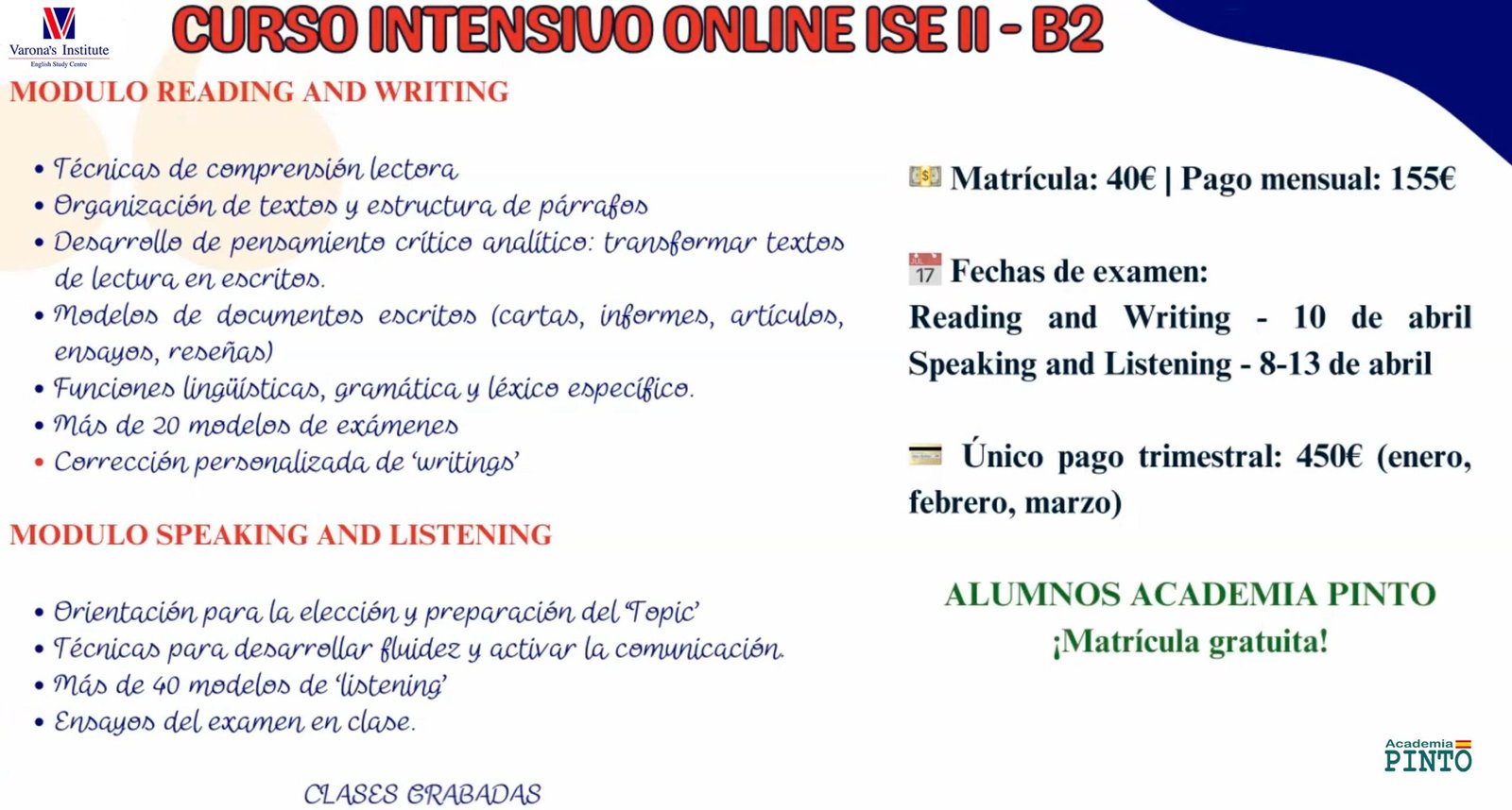 Academia Pinto, pone a disposición de sus alumnos la posibilidad de realizar un 𝐜𝐮𝐫𝐬𝐨 𝐢𝐧𝐭𝐞𝐧𝐬𝐢𝐯𝐨 𝐝𝐞 𝟒 𝐦𝐞𝐬𝐞𝐬 (Enero a Abril) para la preparación del Título Oficial de Idiomas Trinity Collage.
