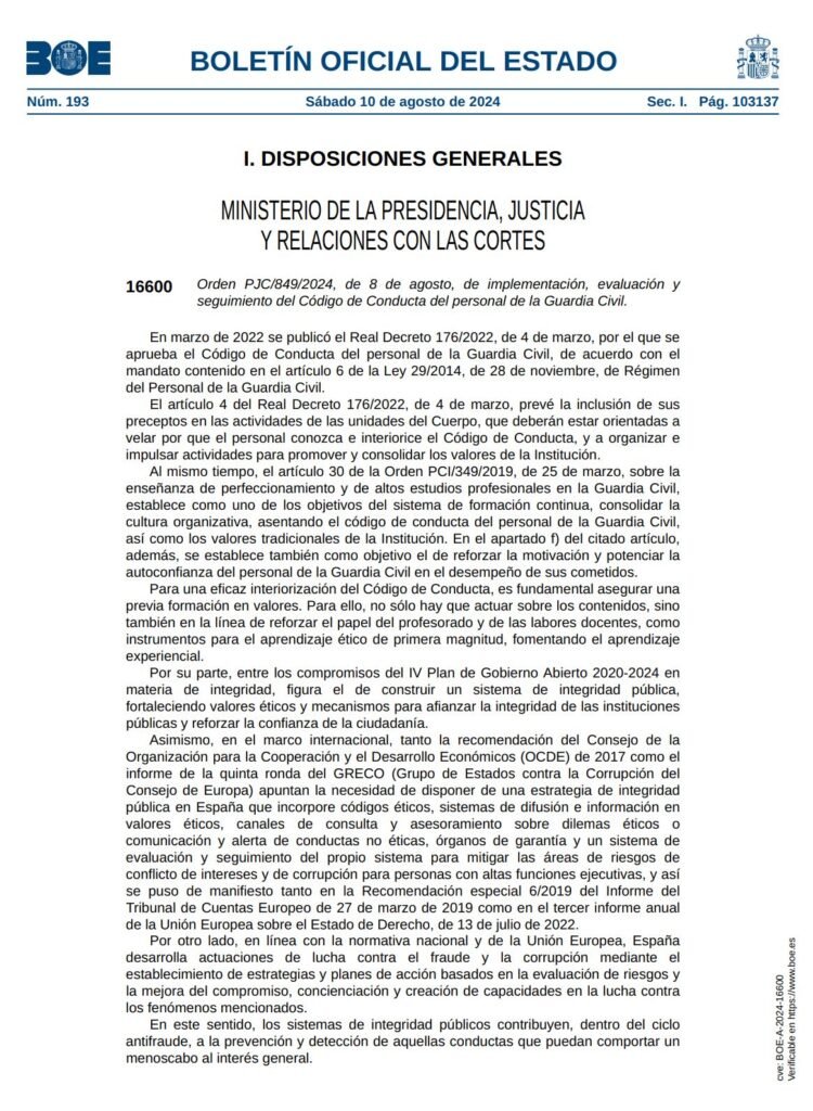 Orden PJC/849/2024, de 8 de agosto, de implementación, evaluación y seguimiento del Código de Conducta del personal de la Guardia Civil